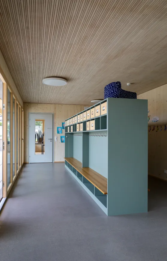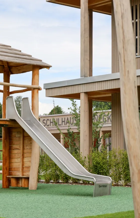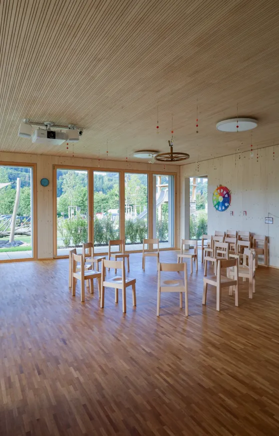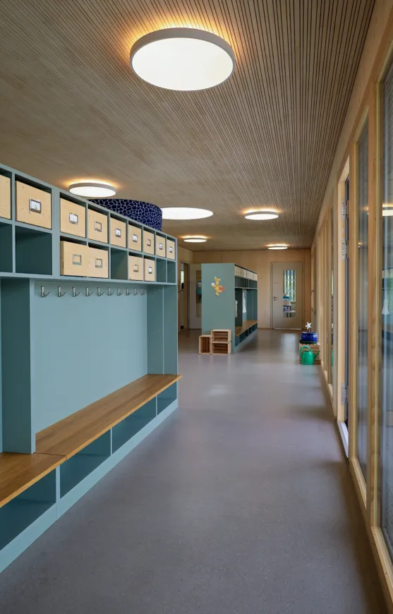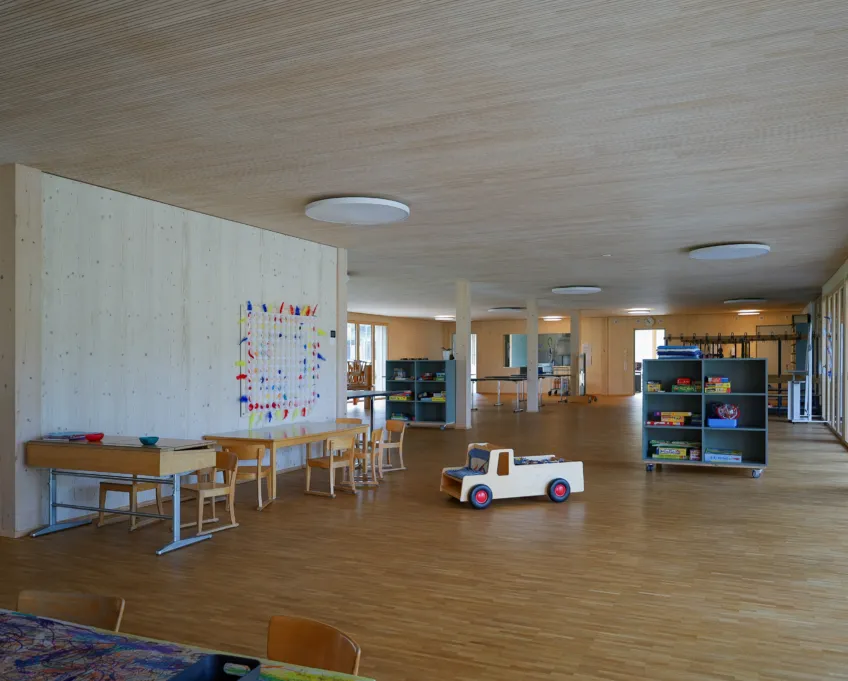 Das neue Gebäude aus Holz und Beton (nur Untergeschoss) erstreckt sich über zwei Geschosse, wobei sich der Kindergarten und die Tagesschule im Erd- und die Unterrichtsräume im Obergeschoss befinden. So verfügt der Kindergarten über einen direkten Zugang zur Aussenspielfläche im Süden und die Tagesschule zum nördlichen Aussenbereich. Um möglichst resiliente Strukturen zu schaffen, sind die Räume bewusst offen gestaltet. Dies ermöglicht Nutzungsänderungen in Zukunft und bietet der Schule eine möglichst flexible Raumaufteilung, die den wechselnden Bedürfnissen angepasst werden kann. Ein zentraler Erschliessungskern verbindet alle Räume und vermittelt in alle Richtungen. Die grossen Fenster und die zusätzlichen Oblichter durchfluten die Räume mit Tageslicht und sorgen für ein angenehmes Aufenthaltsgefühl.